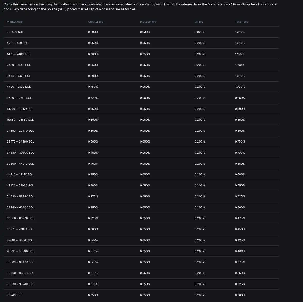 根据 Pump.fun 官方发布的信息,Project Ascend 带来的最核心改变是 Dynamic Fees V1 系统。这个新的分层创作者费用结构彻底改变了此前的固定费率模式。在以往的体系中,创作者无论代币市值高低,都只能获得相同比例的交易费用分成。而现在,系统引入了与市值挂钩的动态费率——市值越高的代币,创作者费用越低,而小型项目则继续贡献较高的费用。这种设计背后的逻辑是鼓励创作者专注于代币的长期成长,而非短期套现。
