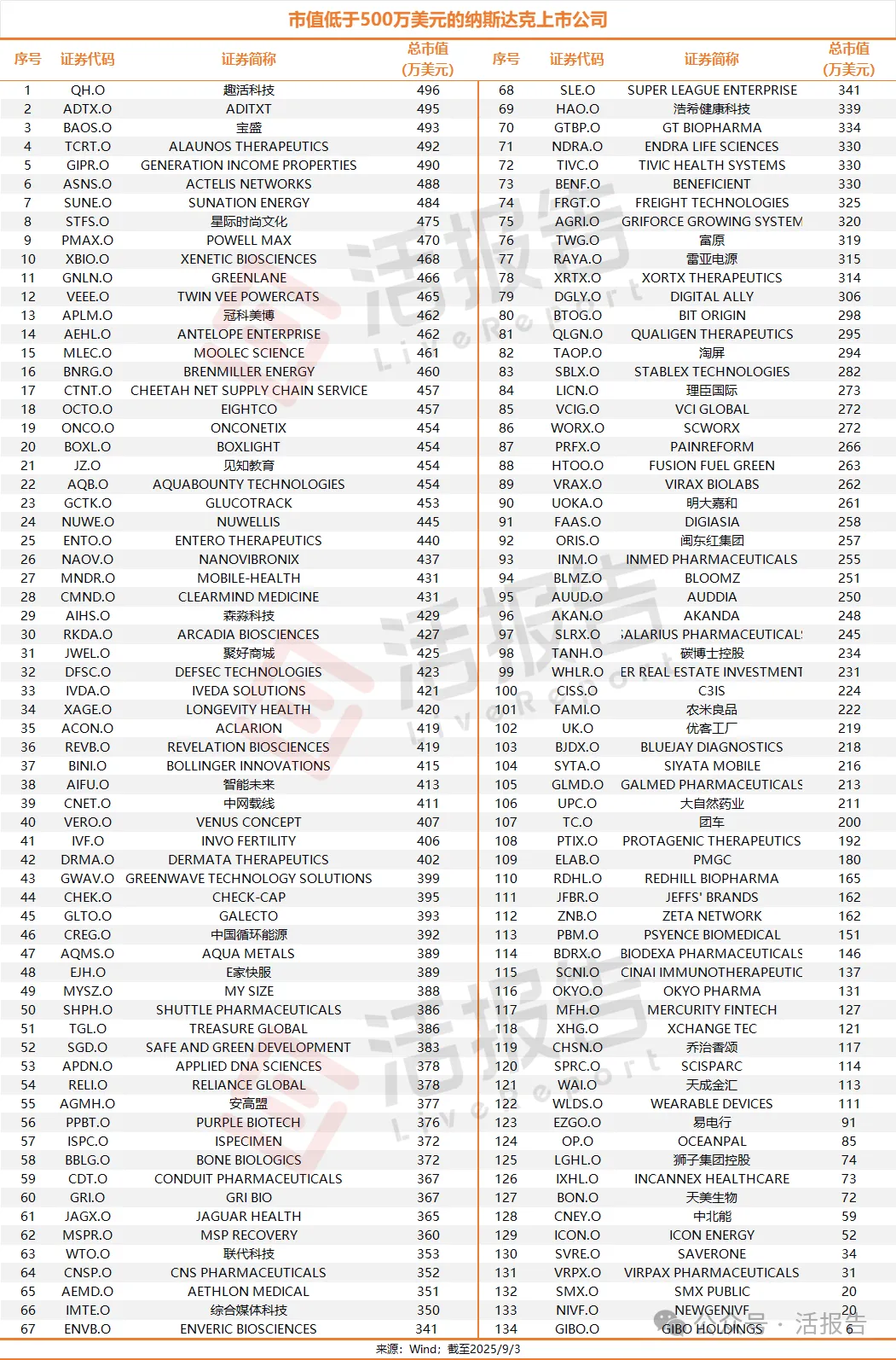 针对存在上市缺陷且上市证券市值低于500万美元的公司,纳斯达克要加快暂停和退市程序。截至9月3日,目前市值低于500万美元的纳斯达克上市公司有134家,其中还包含趣活科技、宝盛、星际时尚文化等31家中国公司(根据办公地址判断)。