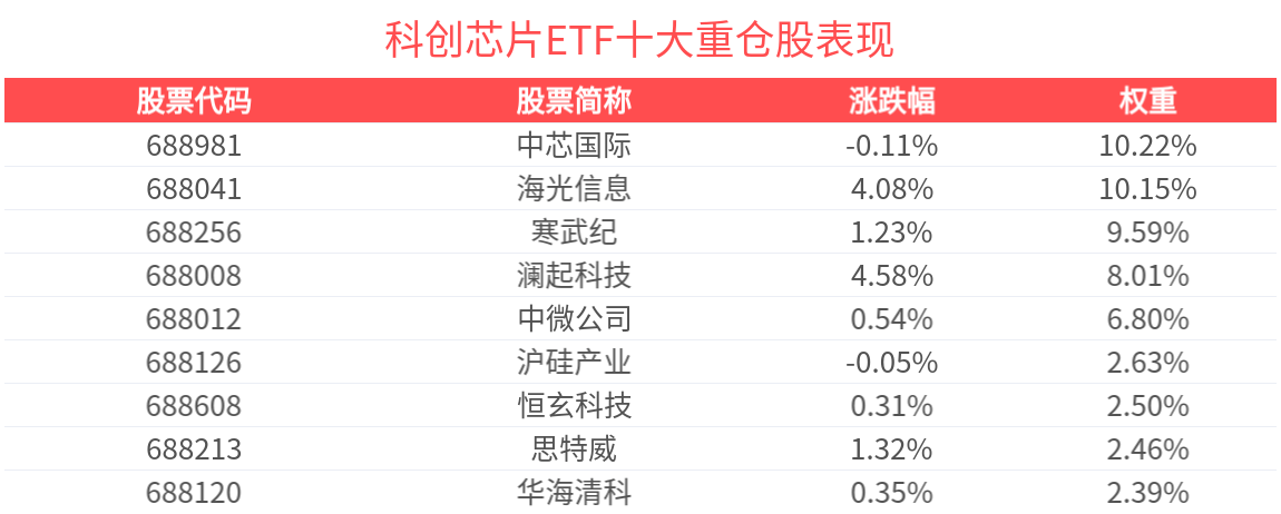 数据显示,截至2025年8月29日,上证科创板芯片指数前十大权重股分别为寒武纪、海光信息、中芯国际、澜起科技、中微公司、芯原股份、东芯股份、沪硅产业、晶晨股份、恒玄科技,前十大权重股合计占比62.02%。