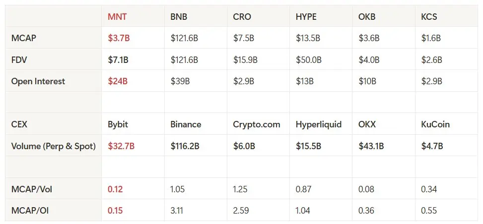尽管执行延迟、对 Bybit 的依赖以及 L2 竞争等风险依然存在,但 MNT 的估值指标明显落后于 BNB、OKB、CRO 和 HYPE 等同行竞争者。