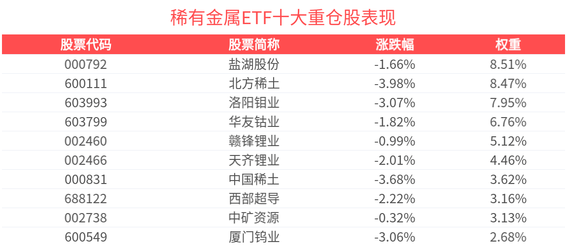 数据显示,截至2025年8月29日,中证稀有金属主题指数前十大权重股分别为北方稀土、洛阳钼业、盐湖股份、华友钴业、天齐锂业、赣锋锂业、中国稀土、盛和资源、中矿资源、厦门钨业,前十大权重股合计占比57.58%。