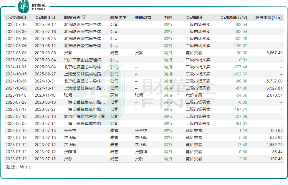 Wind数据显示,自2022年10月以来,重要股东交易记录中未见任何增持,反而出现多笔减持,涉及绍兴伟豪、北京屹唐盛芯、上海武岳峰等机构,以及张紧、冼永辉、张燕祥等公司高管。