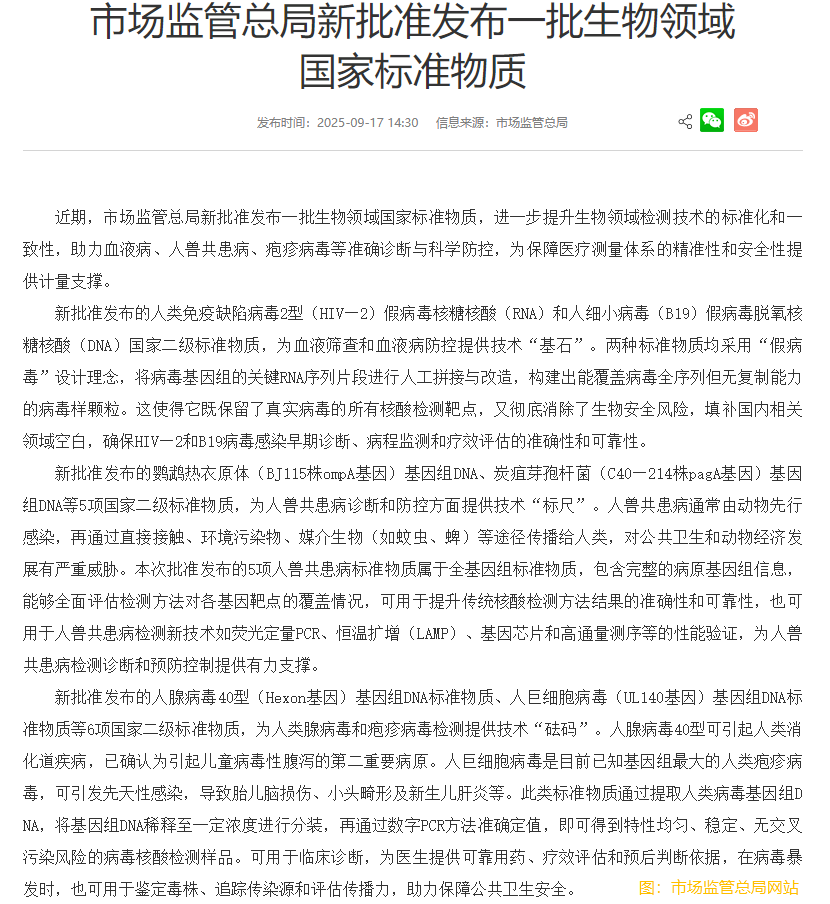 【财华社讯】9月17日,市场监管总局网站发布,近期,市场监管总局新批准发布一批生物领域国家标准物质,进一步提升生物领域检测技术的标准化和一致性,助力血液病、人兽共患病、疱疹病毒等准确诊断与科学防控,为保障医疗测量体系的精准性和安全性提供计量支撑。