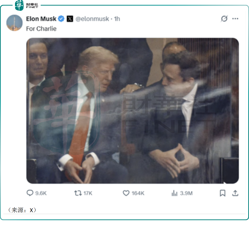 随后,马斯克在社交媒体平台X上发布了自己与特朗普同框交谈的图片,并表示:“为了查理”(For Charlie)。