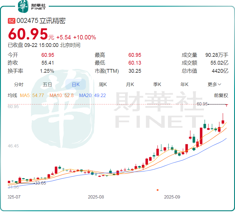 9月22日,千亿巨头立讯精密(002475.SZ)罕见涨停开盘,最高封板资金逾40亿元,直至收盘公司仍涨10%,市值超过4400亿元,堪称“大象起舞”。