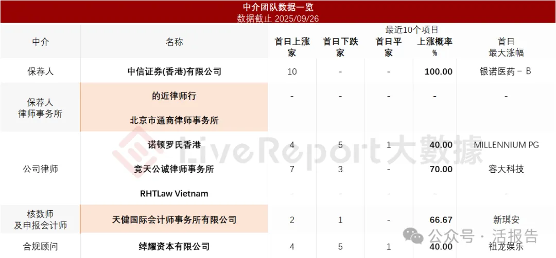 据LiveReport大数据统计,东方科脉中介团队共计8家,其中保荐人1家,保荐项目数据表现卓越;公司律师3家,综合项目数据整体不尽如意。整体而言中介团队历史数据整体表现不尽如意。