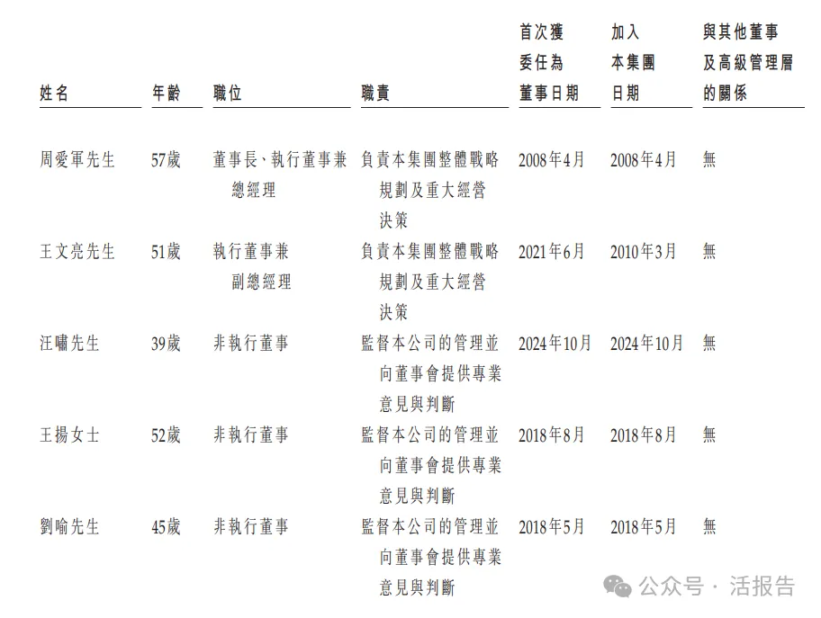 公司董事高层由2位执行董事、4位非执行董事及3位独立非执行董事组成,其中周爱军为董事长、执行董事兼总经理,其主要负责公司的整体战略规划及重大经营决策。