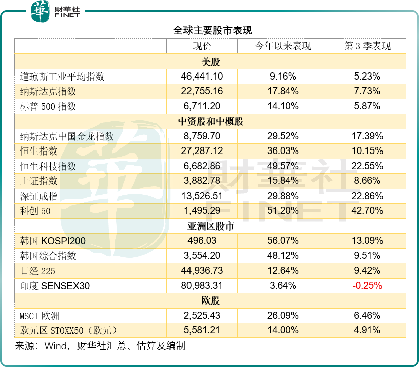 2025年第3季,韩国KOSPI200指数和韩国综合指数的累计涨幅分别只有13.09%和9.51%,而恒生指数和恒生科技指数的季度累计涨幅却分别达到10.15%与22.55%,“百年不动”的A股也有了“动一动”的行情,上证指数、深证成指和科创50的第3季累计涨幅分别为8.66%、22.86%和42.70%,跑赢全球大部分股市。