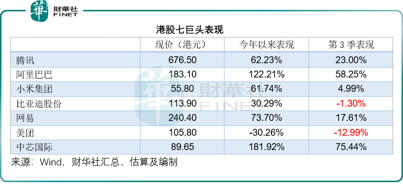 引领港股和中概股大盘表现的是中国的科技巨头,财华社统计了港股(市值)七巨头的表现,市值最高的腾讯(00700.HK)和阿里巴巴(09988.HK)今年均有不俗表现,累计涨幅分别达到62.23%和122.21%,第3季累计涨幅则分别达到23.00%和58.25%。