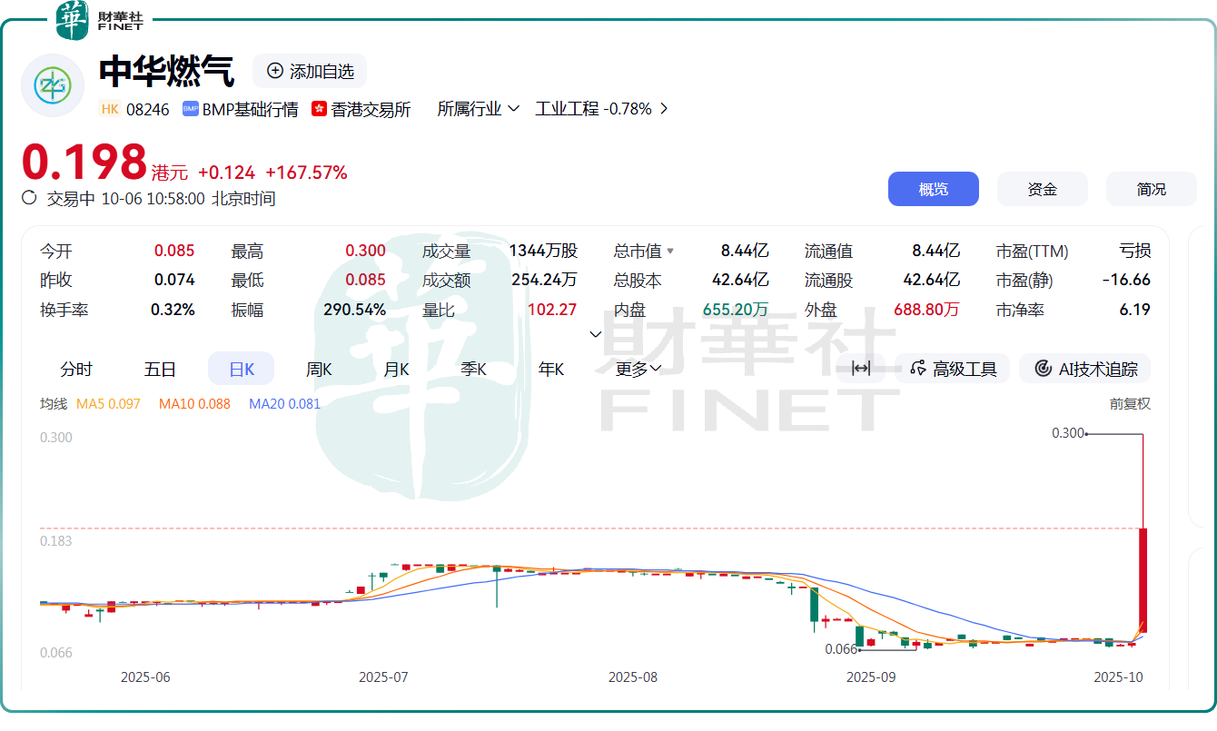 10月6日,港股“仙股”中华燃气(08246.HK)上演了一出惊心动魄的“狂飙”大戏。