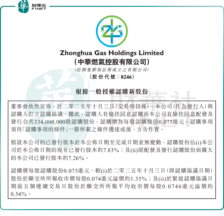 10月5日,中华燃气(08246.HK)发布公告称,公司于2025年10月3日(交易时段后),与认购人订立认购协议。