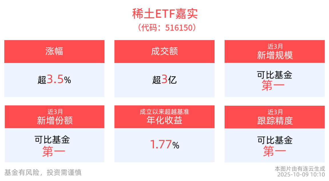 截至2025年10月9日 10:10,中证稀土产业指数强势上涨3.76%,成分股安泰科技上涨10.03%,九菱科技上涨8.69%,金风科技上涨7.15%,包钢股份,三川智慧等个股跟涨。稀土ETF嘉实(516150)上涨3.59%。流动性方面,稀土ETF嘉实盘中换手4.32%,成交3.43亿元。拉长时间看,截至9月30日,稀土ETF嘉实近1周日均成交4.57亿元,居可比基金第一。