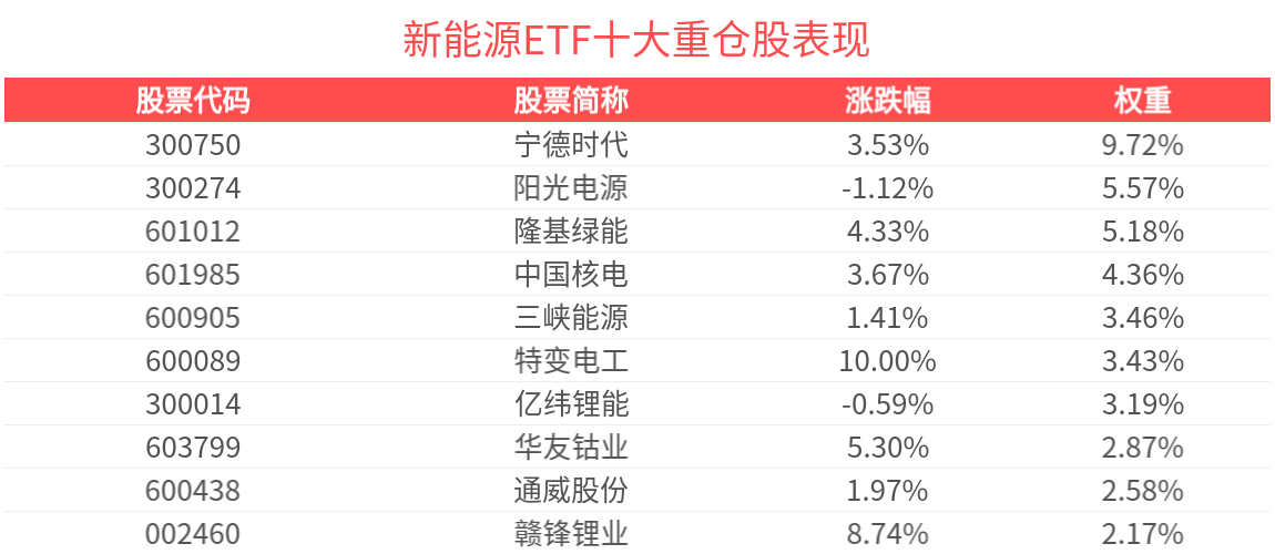 数据显示,截至2025年9月30日,中证新能源指数前十大权重股分别为宁德时代、阳光电源、亿纬锂能、隆基绿能、华友钴业、特变电工、中国核电、赣锋锂业、先导智能、三峡能源,前十大权重股合计占比45.2%。