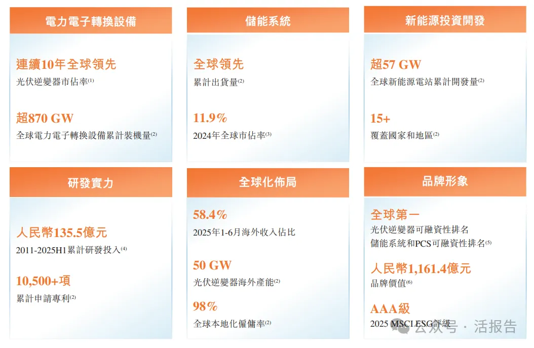 根据弗若斯特沙利文的分析,公司的光伏逆变器产品出货量连续十年保持全球领先;以2024年出货量计,公司的光伏逆变器在全球的市占率约为25.2%;截至2025年6月30日,公司的储能系统累计出货量达70GWh,全球领先。公司已建立了完善的全球网络布局,截至2025年6月30日,产品及服务累计销往全球100多个国家和地区,彰显了公司在全球清洁电力转换领域的引领地位。