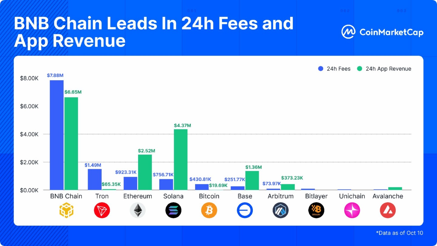 PANews 10月10日消息,据CoinMarketCap数据显示,BNB Chain在过去24小时内以788万美元的手续费和665万美元的应用收入位居榜首。其他主要区块链表现依次为:Solana(应用收入437万美元)、Ethereum(应用收入252万美元)和Tron(手续费收入149万美元)。