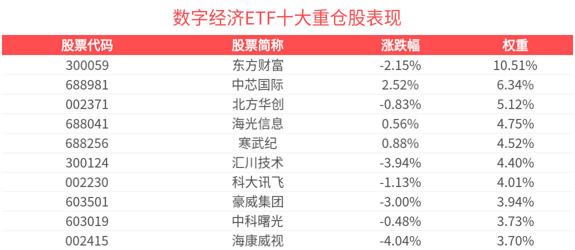 数据显示,截至2025年9月30日,中证数字经济主题指数(931582)前十大权重股分别为东方财富(300059)、中芯国际(688981)、寒武纪(688256)、海光信息(688041)、北方华创(002371)、澜起科技(688008)、中科曙光(603019)、汇川技术(300124)、兆易创新(603986)、中微公司(688012),前十大权重股合计占比54.31%。(以上所列示股票为指数成份股,仅做示意不作为个股推荐。过往持仓情况不代表基金未来的投资方向,也不代表具体的投资建议,投资方向、基金具体持仓可能发生变化。市场有风险,投资需谨慎。)