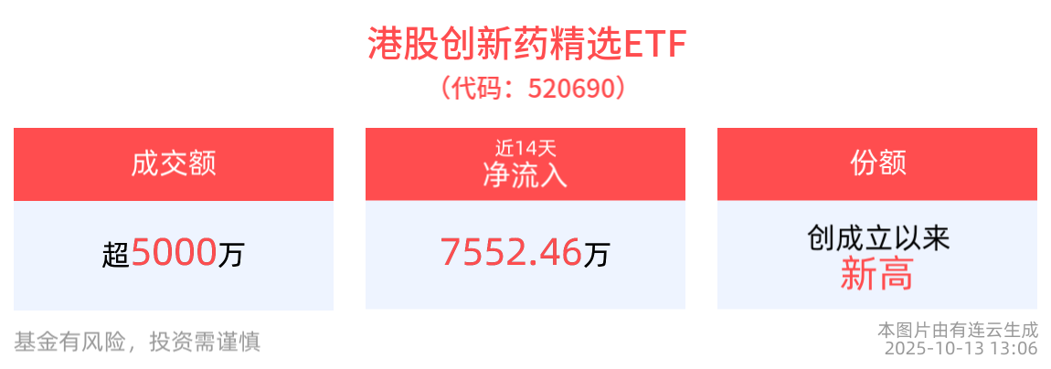 流动性方面,港股创新药精选ETF盘中换手14.35%,成交5985.34万元,市场交投活跃。拉长时间看,截至10月10日,港股创新药精选ETF近1月日均成交1.33亿元。