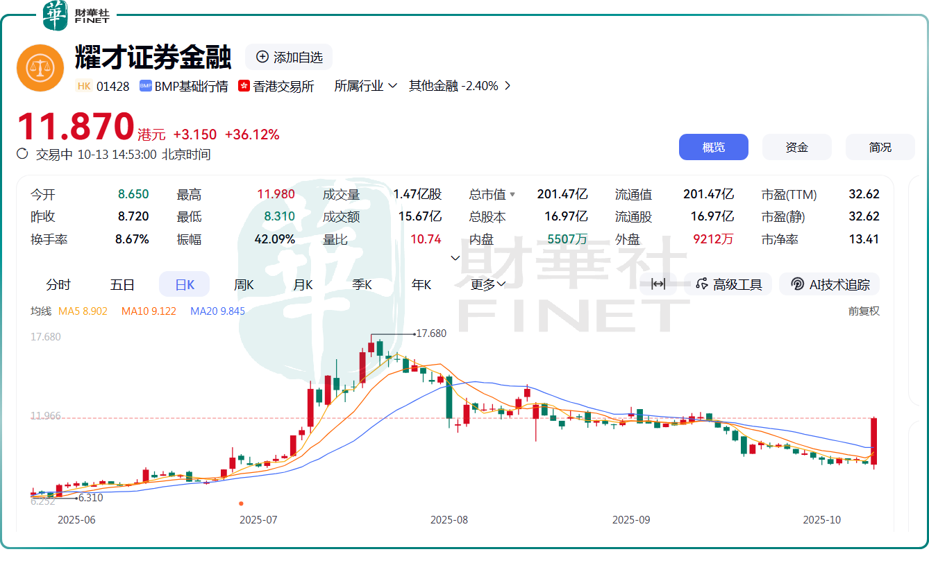 10月13日,耀才证券金融(01428.HK)午后股价上演“狂飙”大戏,截至发稿前,该股涨幅达36.12%,报11.87港元/股,位居港股涨幅榜前列。