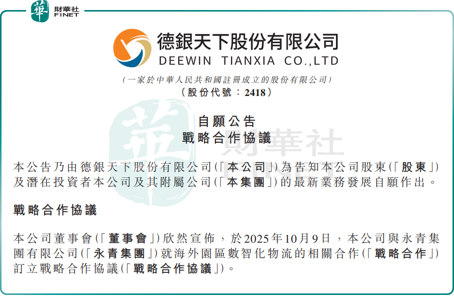 从消息面看,10月9日,德银天下公告称,与永青集团就海外园区数智化物流的相关合作订立战略合作协议。