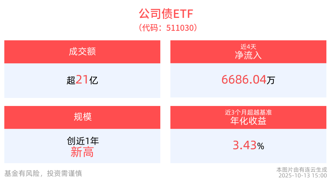 资金流入方面,公司债ETF最新资金流入流出持平。拉长时间看,近4个交易日内,合计“吸金”6686.04万元。