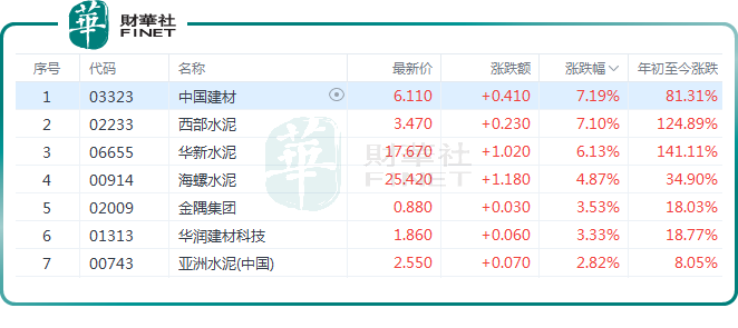 在港股市场,截至发稿前,中国建材(03323.HK)表现最为突出,涨幅为7.19%;西部水泥(02233.HK)紧随其后,上涨7.1%;华新水泥(06655.HK)涨6.13%,海螺水泥(00914.HK)涨4.87%,华润建材科技(01313.HK)跟涨。