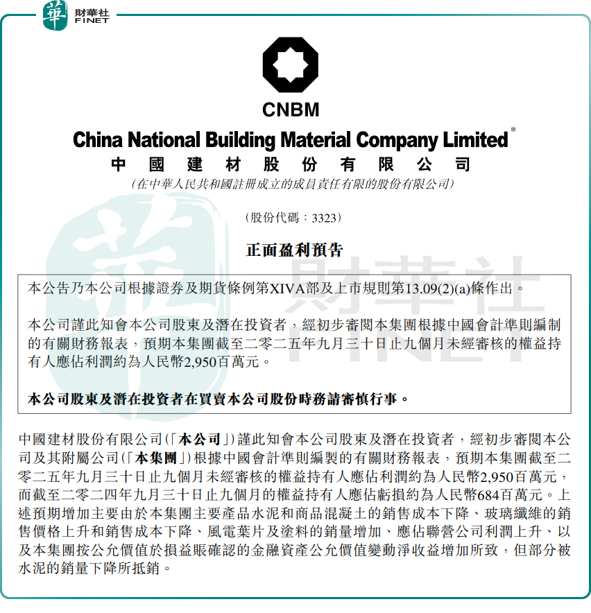 此外,同日,中国建材率先披露2025年前三季度业绩预告,预计归母净利润约为29.5亿元(单位人民币,下同),相较2024年同期亏损约6.84亿元,实现扭亏为盈。