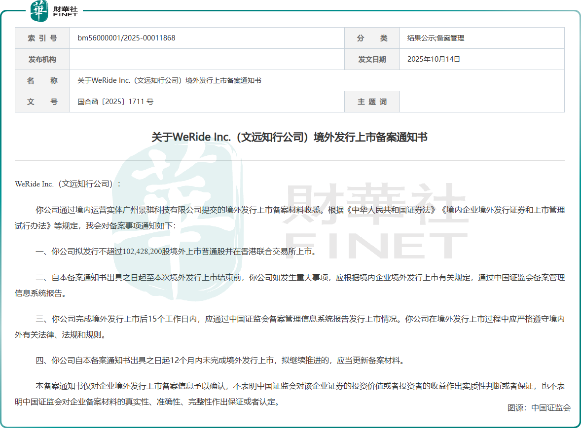 10月14日,中国证监会发布关于Pony AI Inc.(小马智行股份有限公司)和WeRide Inc.(文远知行公司)境外发行上市备案通知书,标志着两家公司自今年3月传出的港股上市计划取得重要进展。