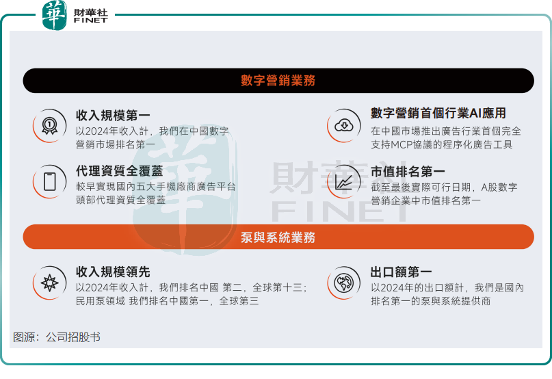 利欧股份在这两大领域均位居行业前列,根据弗若斯特沙利文,按照2024年收入计算,公司是国内排名第二的泵与系统提供商;同时,公司在中国数字营销市场及数字广告代理市场两大赛道的排名均位列第一。