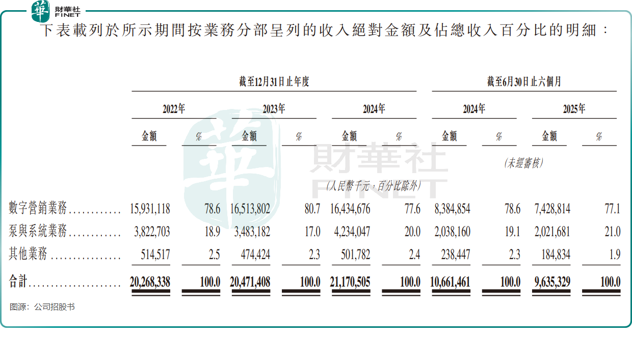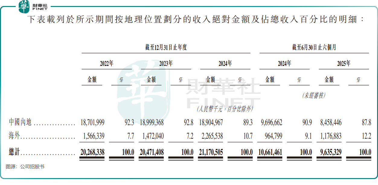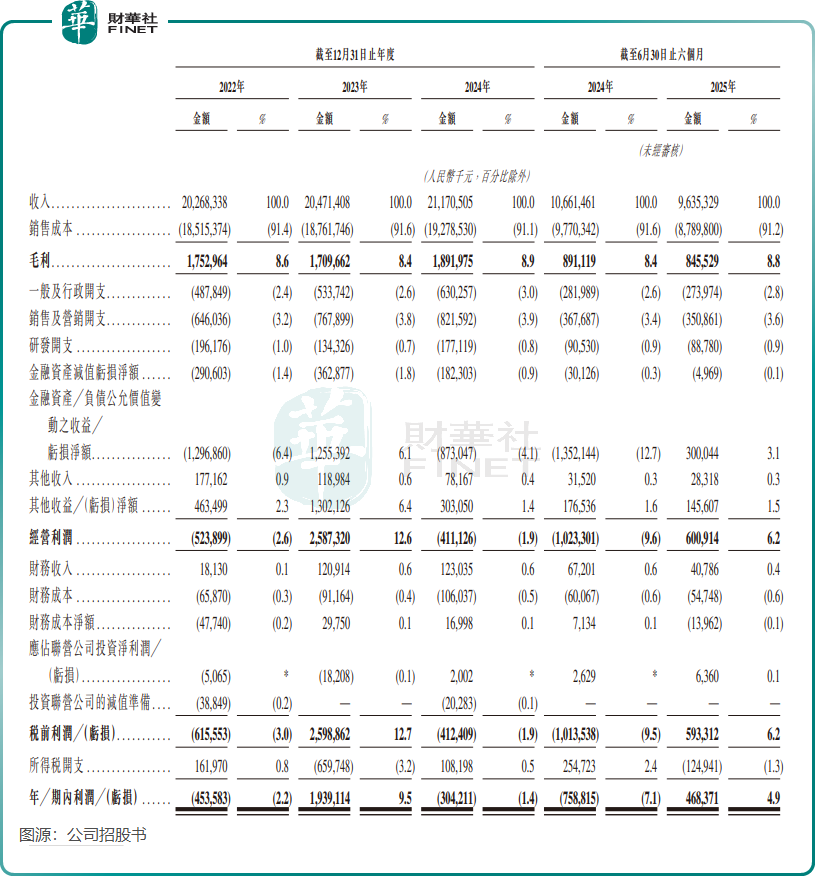 招股书显示,2022年至2024年,公司总营收分别为202.68亿元(单位人民币,下同)、204.71亿元和211.71亿元;2025年上半年营收为96.35亿元,较上年同期的106.61亿元有所下滑。