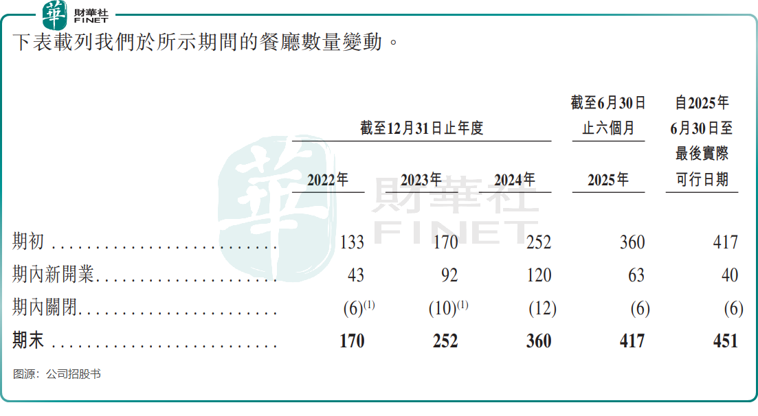 截至2025年10月8日,公司餐厅网络已覆盖中国内地22个城市及香港特别行政区,门店总数达451家,而在2022年时仅为170家。