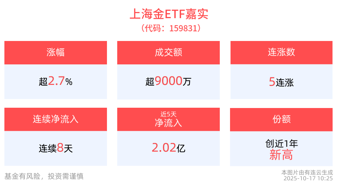 场内ETF方面,截至2025年10月17日 10:25,上海金ETF嘉实(159831)上涨2.70%, 冲击5连涨。拉长时间看,截至2025年10月16日,上海金ETF嘉实近1周累计上涨5.81%。