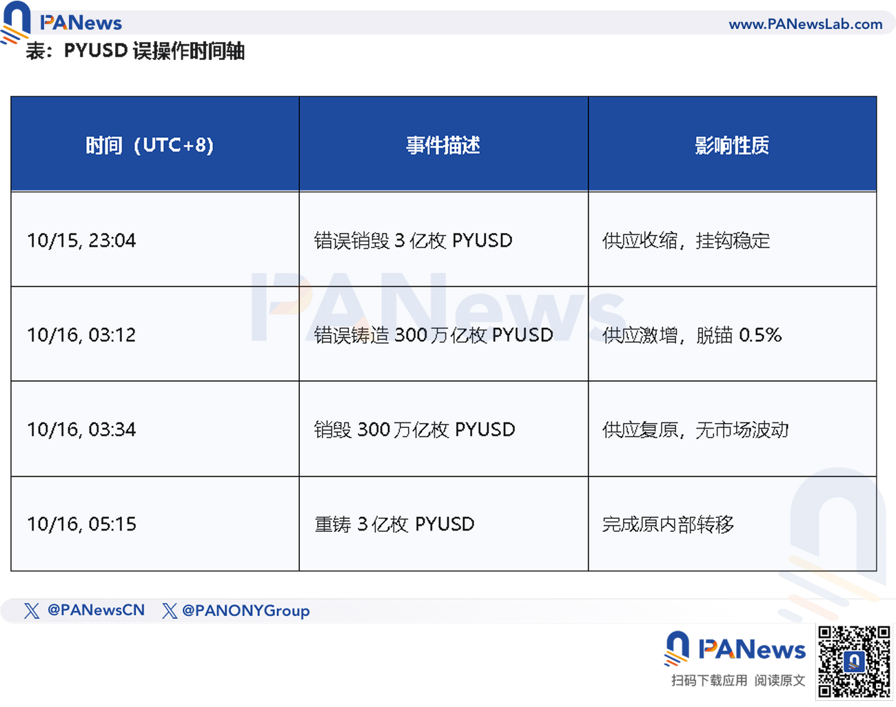 10月16日凌晨,加密市场出现戏剧性一幕,稳定币发行机构Paxos突然铸造并销毁了300万亿枚PayPal USD(PYUSD),让市场一头雾水。这一“乌龙”事件不仅是一次单纯的人工失误,更生动地揭示了中心化稳定币在技术治理与内部控制层面存在着固有的脆弱性。