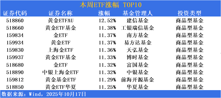 具体来看,得益于美联储降息刺激与市场避险情绪的发酵,现货黄金价格势如破竹,在10月17日亚洲交易时段逼近4400美元/盎司大关,连续刷新历史峰值,涨幅前十的ETF中被黄金赛道所占领。其中黄金ETFAU(518860)涨幅超12%位居榜首,黄金ETF基金(518660)、金ETF(159834)等多支黄金ETF基金涨超11%。