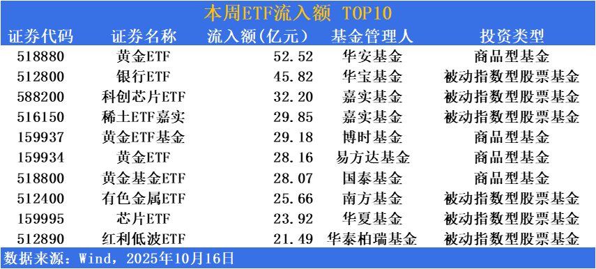 本期(2025年10月13日-10月16日),美联储降息预期、贸易摩擦升级与区域政治风险交织,共同推升黄金避险与配置需求。短线虽处超买区间,但波动率提升更多体现情绪扩张而非趋势反转,中期多头逻辑仍稳固。黄金ETF兴业(518880)流入超50亿,领跑市场。银行ETF(512800)流入超40亿位居次席,科创芯片ETF(588200)流入超30亿,位居流入榜第三,流入榜前十大ETF多数涉及避险资产。