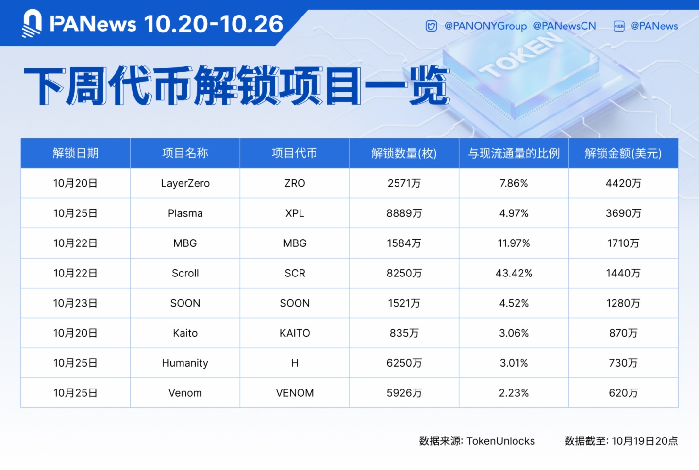 PANews 10月19日消息,Token Unlocks数据显示,ZRO、XPL、MBG等代币将于下周迎来大额解锁,其中: