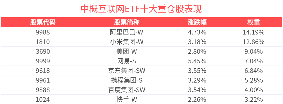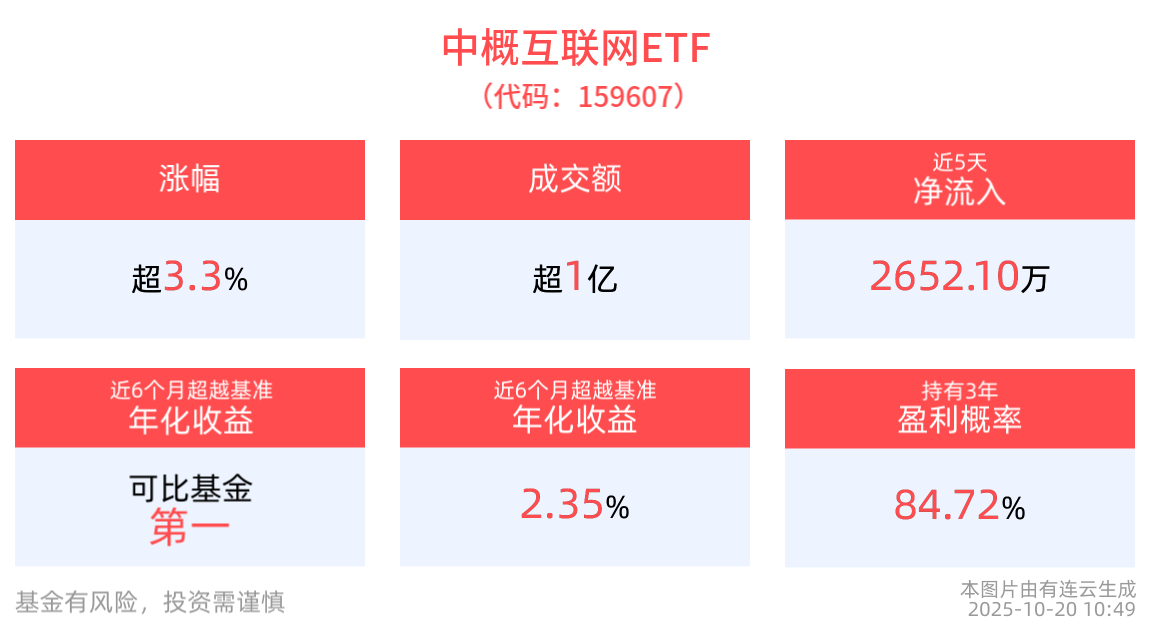 截至2025年10月20日 10:49,中概互联网ETF(159607)上涨3.39%。成分股方面,网易-S涨5.45%,阿里巴巴-W涨5.05%,百度集团-SW涨4.07%,京东健康涨4.03%。