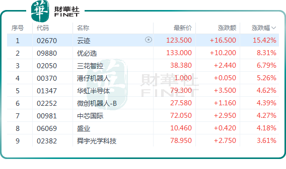 截至发稿前,云迹(02670.HK)大涨15.42%,优必选(09880.HK)涨8.31%,三花智控(02050.HK)涨6.79%,微创机器人-B(02252.HK)涨4.39%,极智嘉-W(02590.HK)等跟涨。