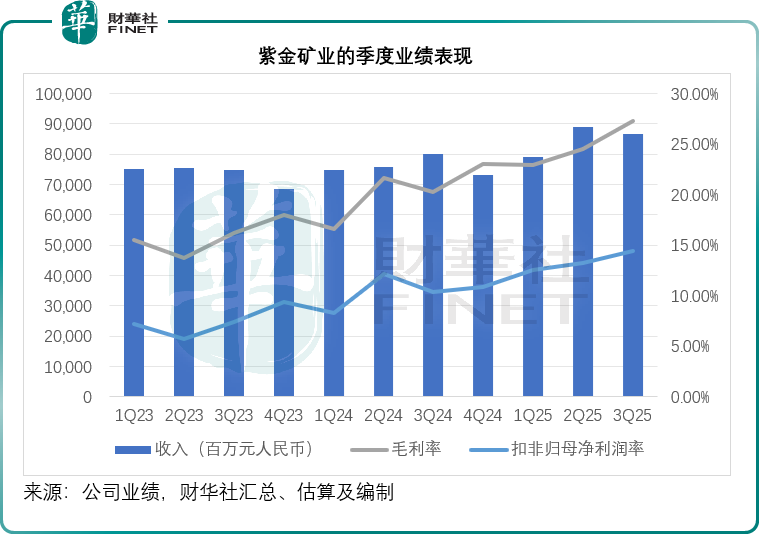 2025年第3季,紫金矿业的收入按年增长8.14%,至864.89亿元;扣非归母净利润按年增长50.37%,至125.03亿元,在有利的金银价上升推动下,其毛利率和利润率均有不俗的表现,见下图,紫金矿业第3季毛利率由上年同期的20.24%和上个季度的24.52%,上升至27.23%;扣非归母净利润率则由上年同期的10.40%和上个季度的13.23%,上升至14.46%。