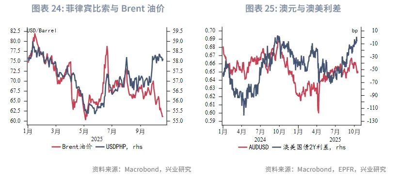 受鲍威尔本周鸽派发言影响,美联储降息预期上升,叠加美国银行业担忧,美元指数下跌-0.6%至98.56。由于澳大利亚9约失业率意外上升,市场强化澳联储11月降息的可能,澳元出现大幅贬值,新西兰元也受此拖累。受美国关税言论重燃、高市早苗出任首相前景不明朗影响,日元在避险属性下大幅升值。东南亚货币中,泰铢出现贬值,主要因泰国国内股市下跌、央行降息预期仍存,逐渐打破其与金价的正相关性。新加坡元因本周MAS维持S$NEER政策区间带不变而小幅升值。