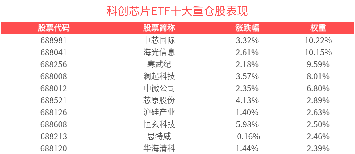 数据显示,截至2025年9月30日,上证科创板芯片指数前十大权重股分别为海光信息、澜起科技、中芯国际、寒武纪、中微公司、芯原股份、华虹公司、沪硅产业、华海清科、晶晨股份,前十大权重股合计占比59.69%。