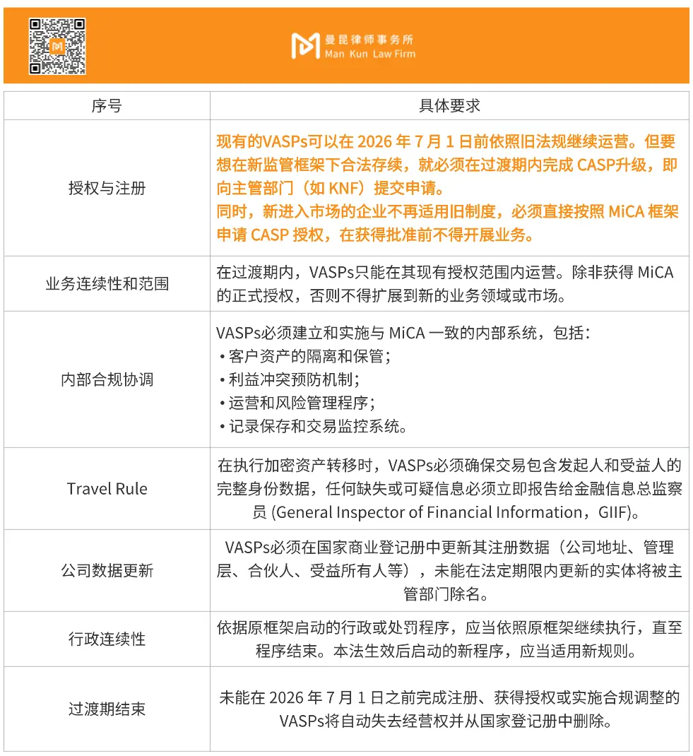 为帮助市场平稳过渡避免运营中断,法案为现有加密资产服务提供商(VASPs)注册实体建立了过渡期:目前按照反洗钱法规注册的VASPs,可在2026年7月1日前按照现行规则继续合规经营,但必须逐步升级至新标准,直到获得CASP授权或截止日期。以下是法案对过渡期的具体要求,另外市场主体也需要注意配套法案落地的次级规则出台的生效情况。