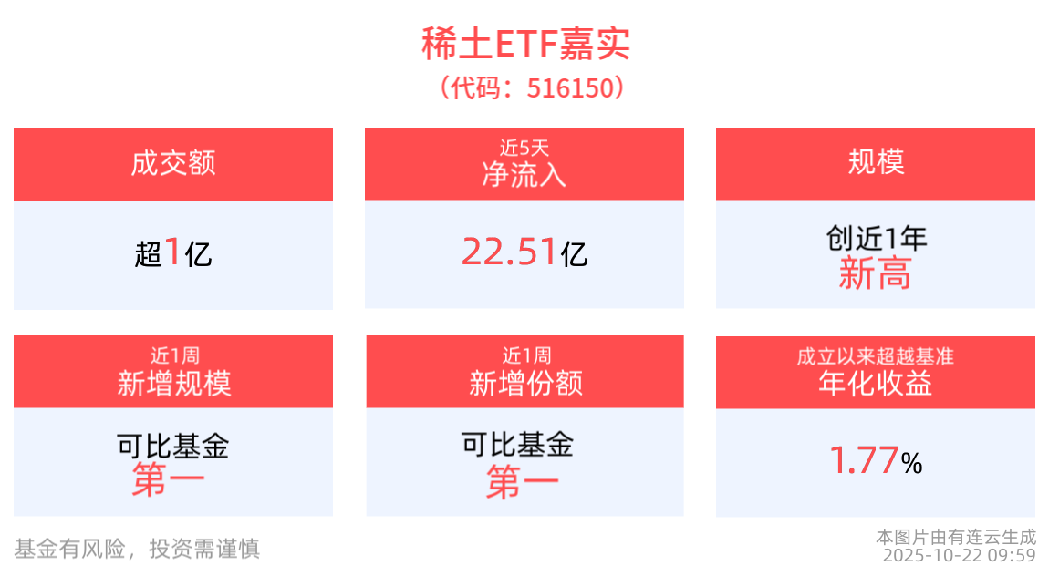 资金流入方面,拉长时间看,稀土ETF嘉实近5个交易日内有4日资金净流入,合计“吸金”22.51亿元。