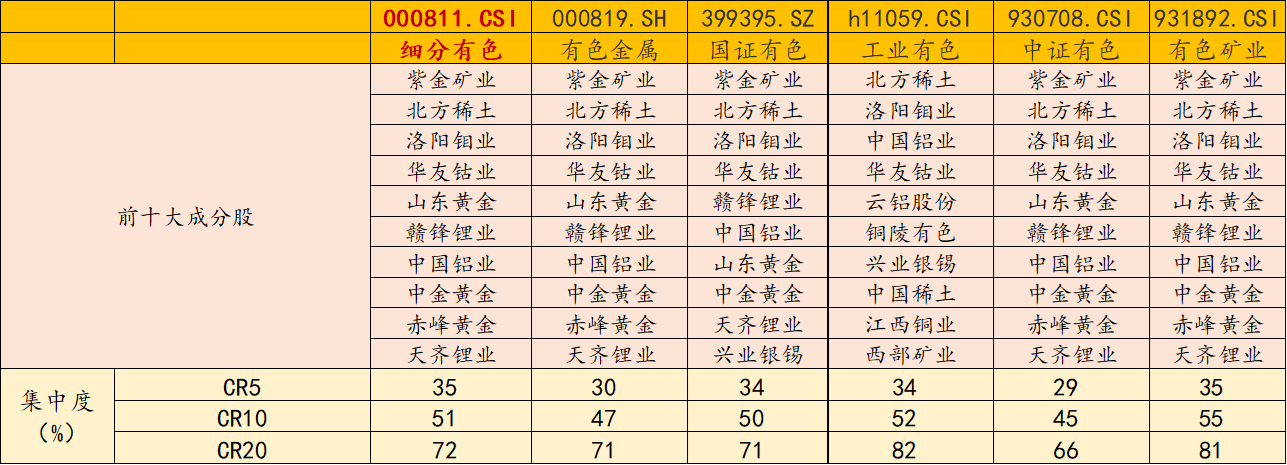风险提示:基金有风险,投资需谨慎。投资人应当阅读《基金合同》《招募说明书》《产品资料概要》等法律文件,了解基金的风险收益特征,特别是特有风险,并根据自身投资目的、投资经验、资产状况等判断是否和自身风险承受能力相适应。基金管理人承诺以诚实信用、谨慎尽责的原则管理和运用基金资产,但不保证基金一定盈利或本金不受损失。以上基金属于中等风险等级(R3)产品,适合经客户风险承受等级测评后结果为平衡型(C3)及以上的投资者。请投资者关注指数化投资的风险以及集中投资于细分有色指数成分股的持有风险,请关注部分指数成分股权重较大、集中度较高的风险,请关注指数化投资的风险、ETF运作风险、投资特定品种的特有风险等。文中提及个股仅为指数成份股客观展示列举,本文出现信息只作为参考,投资人须对任何自主决定的投资行为负责。本文中的任何观点、分析及预测不构成对阅读者任何形式的投资建议。