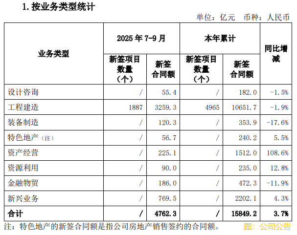 【财华社讯】中国中铁(00390.HK)公布,第三季度新签合同额合计4762.3亿元(人民币,下同);前三季度累计新签合同额合计15849.2亿元,同比增长3.7%。其中,境內新签合同额14182.8亿元,同比增长1%;境外新签合同额1666.4亿元,同比增长35.2%。公司目前无已签订尚未执行的重大项目。