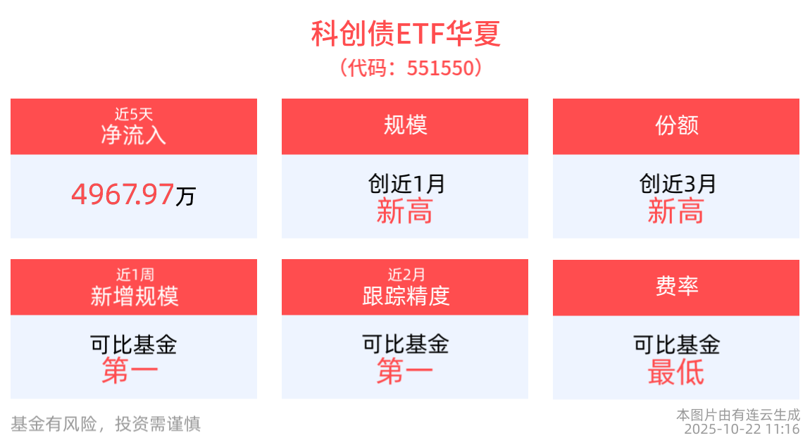 截至2025年10月22日11:16,科创债ETF华夏(551550)上涨0.03%,最新价报99.39元。截至10月21日,流动性方面,科创债ETF华夏近1周日均成交68.64亿元;资金流入方面,科创债ETF华夏最新资金净流入4967.97万元;规模方面,科创债ETF华夏最新规模达153.61亿元,创近1月新高;跟踪精度方面,科创债ETF华夏近2月跟踪误差为0.005%,在可比基金中跟踪精度最高。