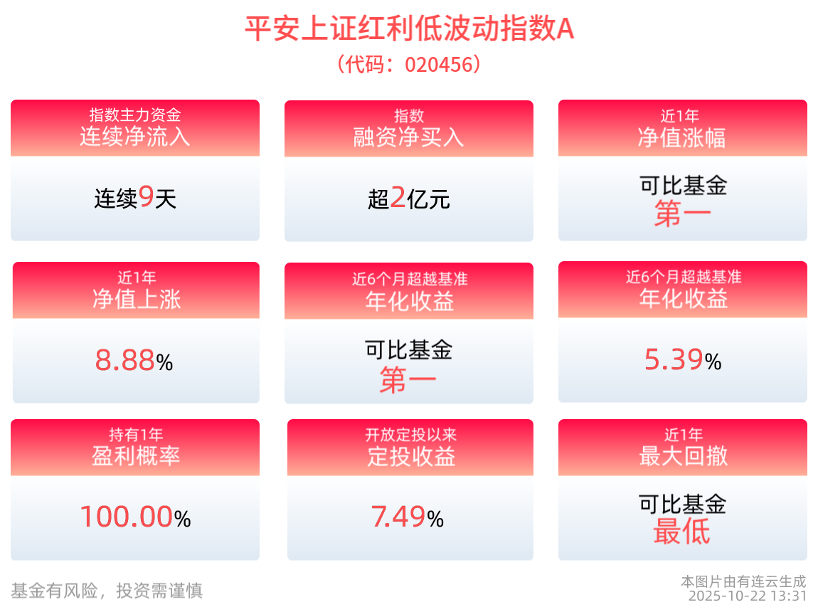 关注平安上证红利低波动指数A(020456),关联基金(平安上证红利低波动指数E:024611;平安上证红利低波动指数C:020457)。