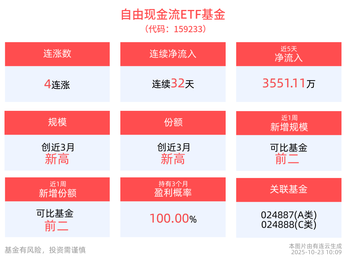 从收益能力看,截至2025年10月22日,自由现金流ETF基金自成立以来,最高单月回报为7.80%,最长连涨月数为4个月,最长连涨涨幅为12.71%,涨跌月数比为4/0,上涨月份平均收益率为3.08%,月盈利百分比为100.00%,月盈利概率为90.24%,历史持有3个月盈利概率为100.00%。