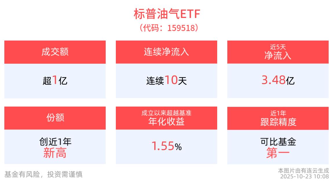 场内ETF方面,截至2025年10月23日 10:08,标普油气ETF(159518)下修调整。拉长时间看,截至2025年10月22日,标普油气ETF近半年累计上涨12.37%。