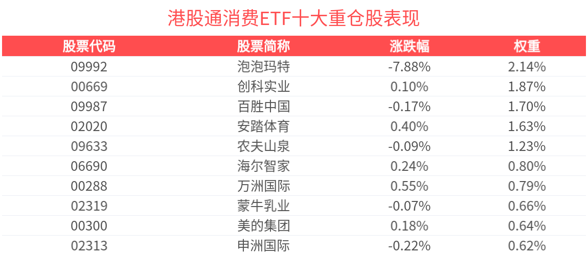 数据显示,截至2025年10月22日,恒生消费指数前十大权重股分别为创科实业、泡泡玛特、百胜中国、安踏体育、农夫山泉、万洲国际、海尔智家、申洲国际、美的集团、蒙牛乳业,前十大权重股合计占比59.31%。