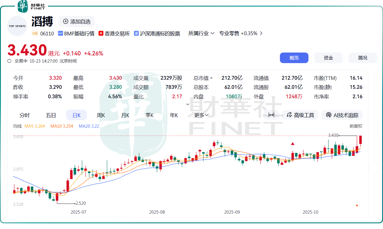 或受此影响,10月23日,滔搏股价走势震荡,盘初大幅拉升逾4%,但随后迅速回落,一度下跌0.3%,多空博弈激烈。截至发稿前,该股涨幅4.26%,报3.43港元/股。